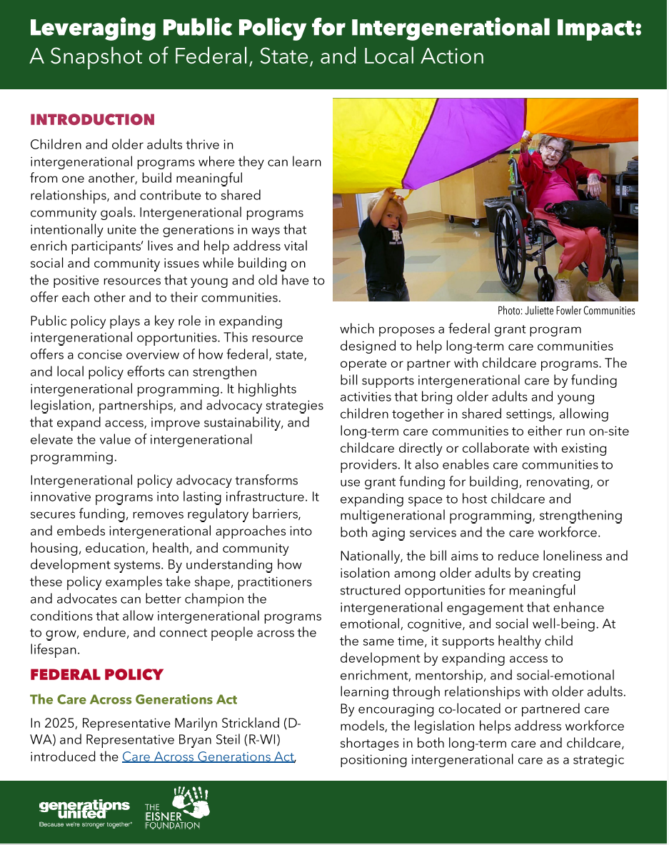 Public policy plays a key role in expanding intergenerational opportunities. This resource offers a concise overview of how federal, state, and local policy efforts can strengthen intergenerational programming. It highlights legislation, partnerships, and advocacy strategies that expand access, improve sustainability, and elevate the value of intergenerational programming.
